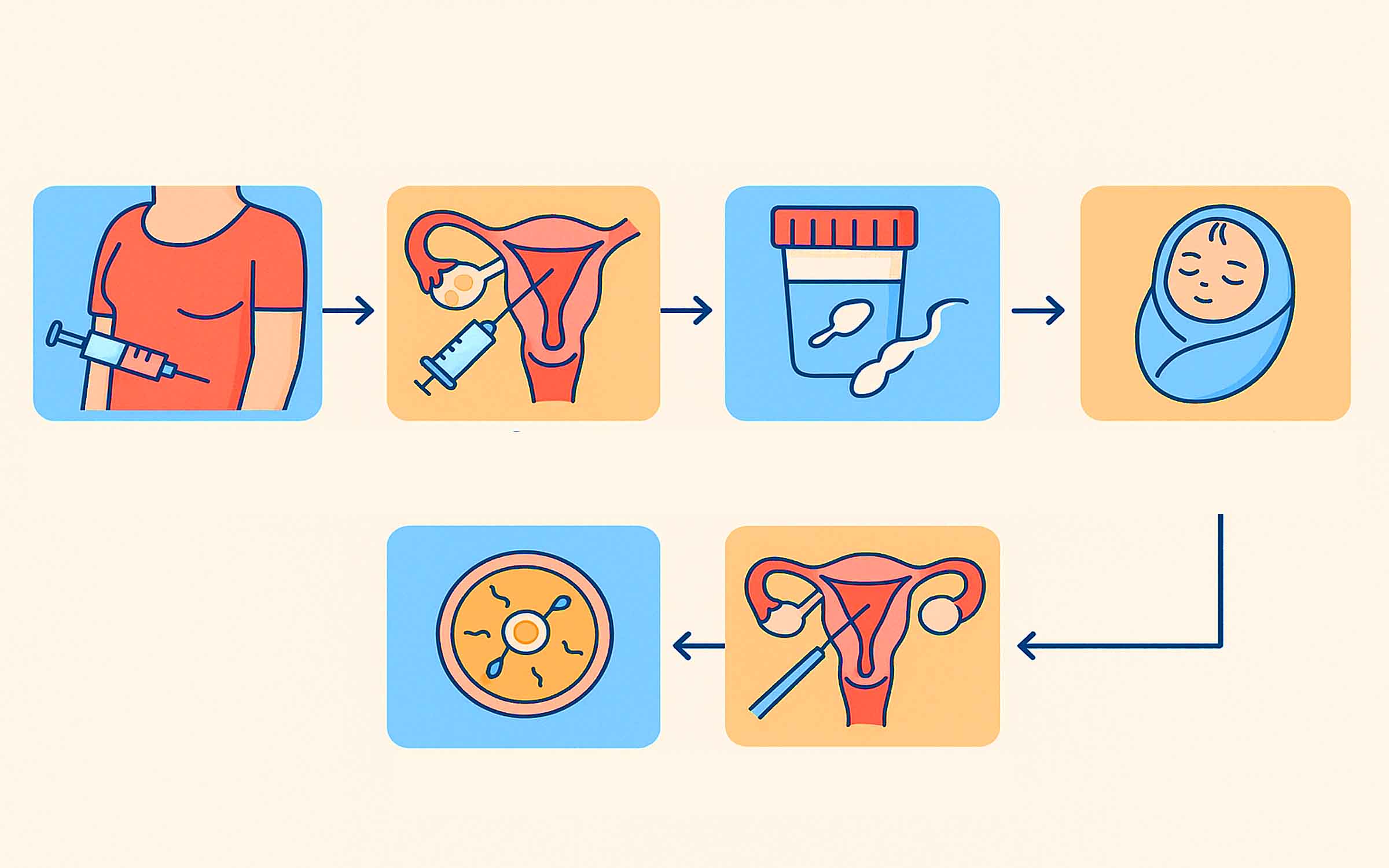 उपचारको क्रममा सुरुमा महिलालाई अण्डा उत्पादन बढाउने विशेष हर्मोन औषधि दिइन्छ। त्यसपछि Ultrasound को सहायताले अण्डाशयबाट अण्डा निकालिन्छ। अर्कोतर्फ, पुरुषबाट वीर्य सङ्कलन गरिन्छ र स्वस्थ शुक्राणुहरू छुट्याइन्छन्। यी अण्डा र शुक्राणुलाई प्रयोगशालामा निषेचित गरी भ्रूण विकास गराइन्छ। विकसित भ्रूणलाई केही दिन शरीरबाहिर राखेर मूल्याङ्कन गरिन्छ, र सबैभन्दा स्वस्थ भ्रूण महिलाको गर्भाशयमा स्थानान्तरण गरिन्छ। यसरी सफल भएमा गर्भ रहन्छ।