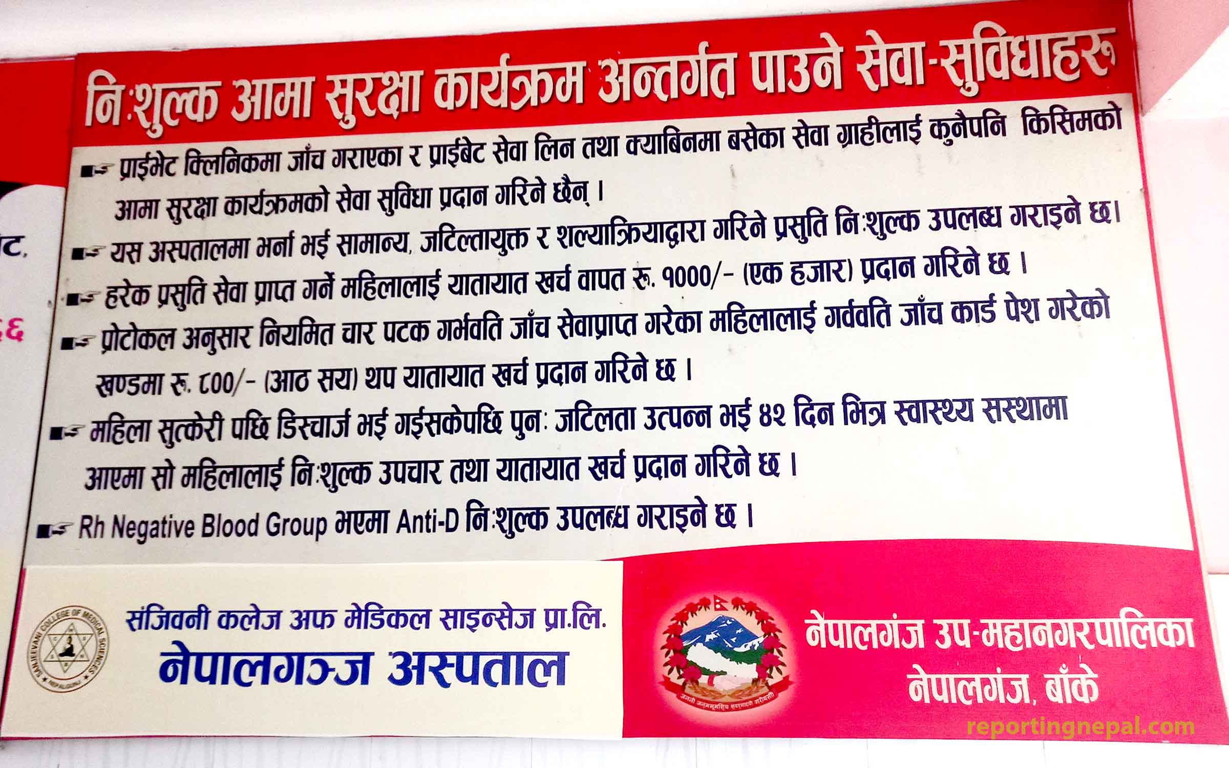 अस्पतालको प्रवेशद्वारदेखि भित्तासम्म ‘निःशुल्क आमा सुरक्षा कार्यक्रम’ लेखिएको ब्यानर टाँसिएको भए पनि पनि वास्तविकता भने ५३ हजारदेखि ६० हजार रुपैयाँसम्मका ‘सर्जरी प्याकेज’ थोपारिन्थ्यो। अप्रेसन गरेकै दिन सामान्य सिरिन्ज, क्यानुला आइ भि सेट, औषधी सामग्रीहरु , अब यो प्याकेज भित्र पर्दैन भन्दै क्यानुला, सलाइनजस्ता सामान्य उपकरण छुट्टै किन्न लगाइ उपचार खर्च अझै महँगो बनाई ५०/६० हजारको प्याकेज लाखौंमा परिणत गर्ने गरिएको पोस्टमा लेखेका छन् l